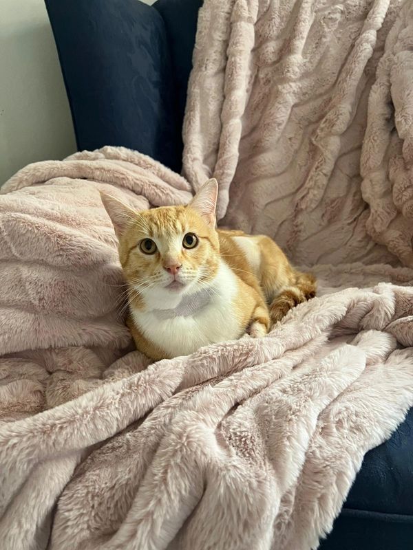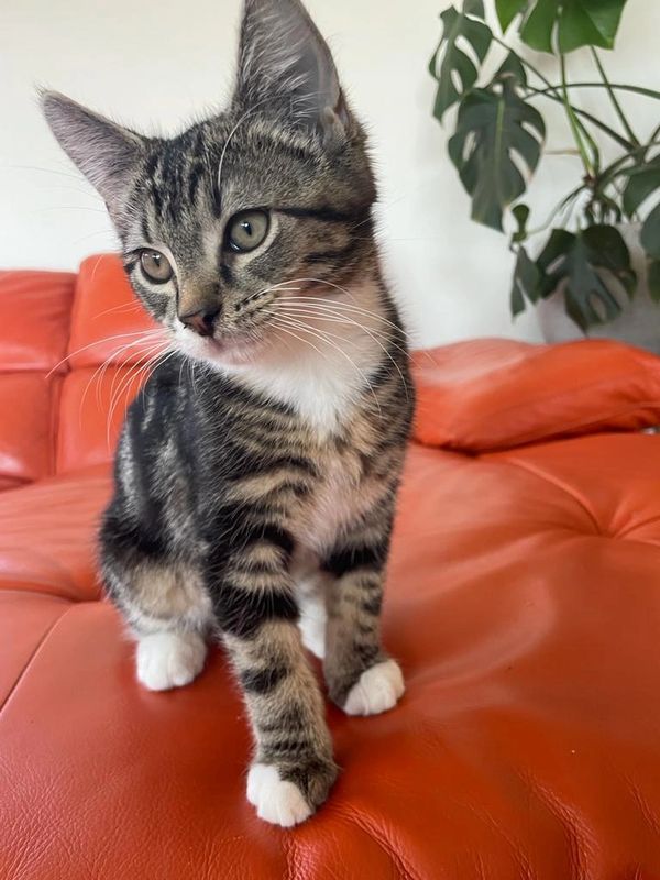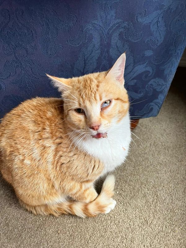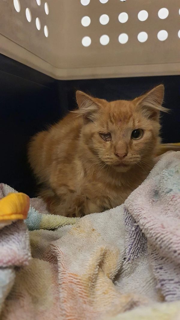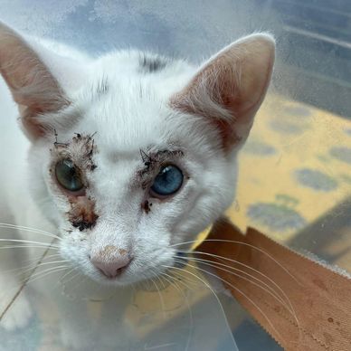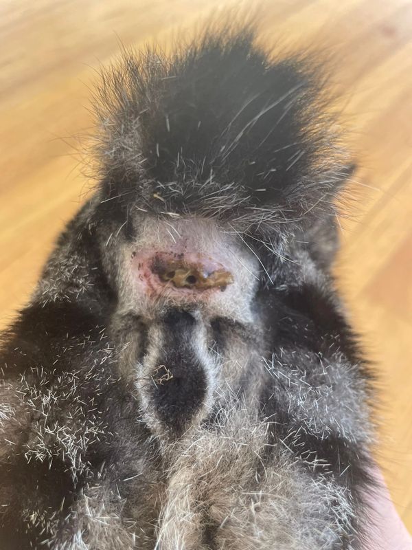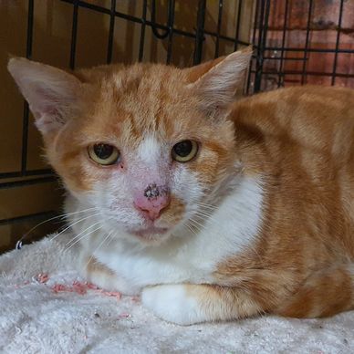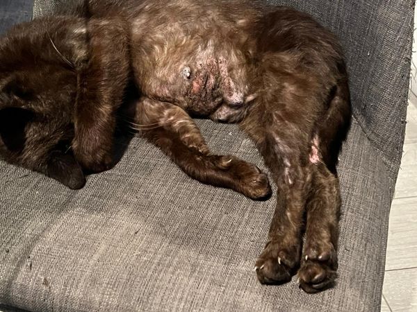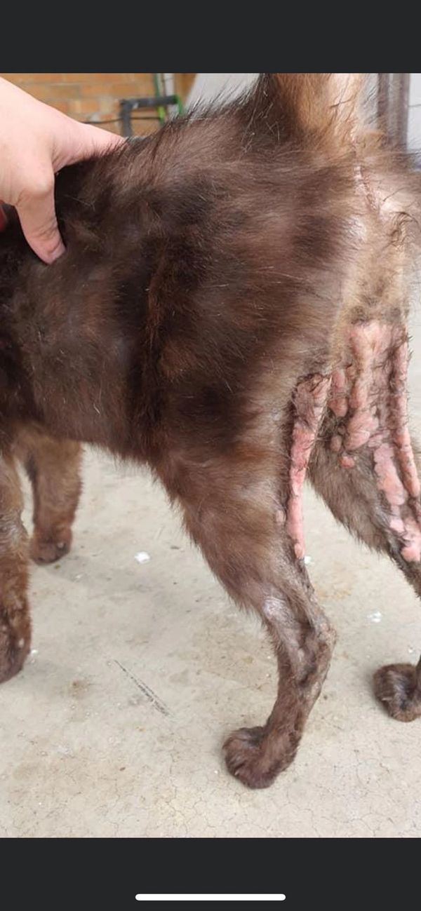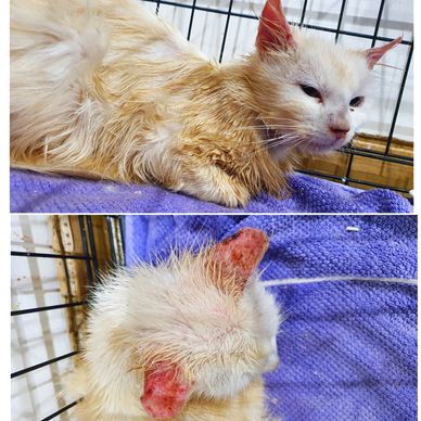 Angel was rescued from a drain. He was cold, scared, very underweight and sick. We treated Angelo for emaciation, and very sore ears. His ears were hairless and covered in horrendous scabs from a Ringworm infection.